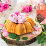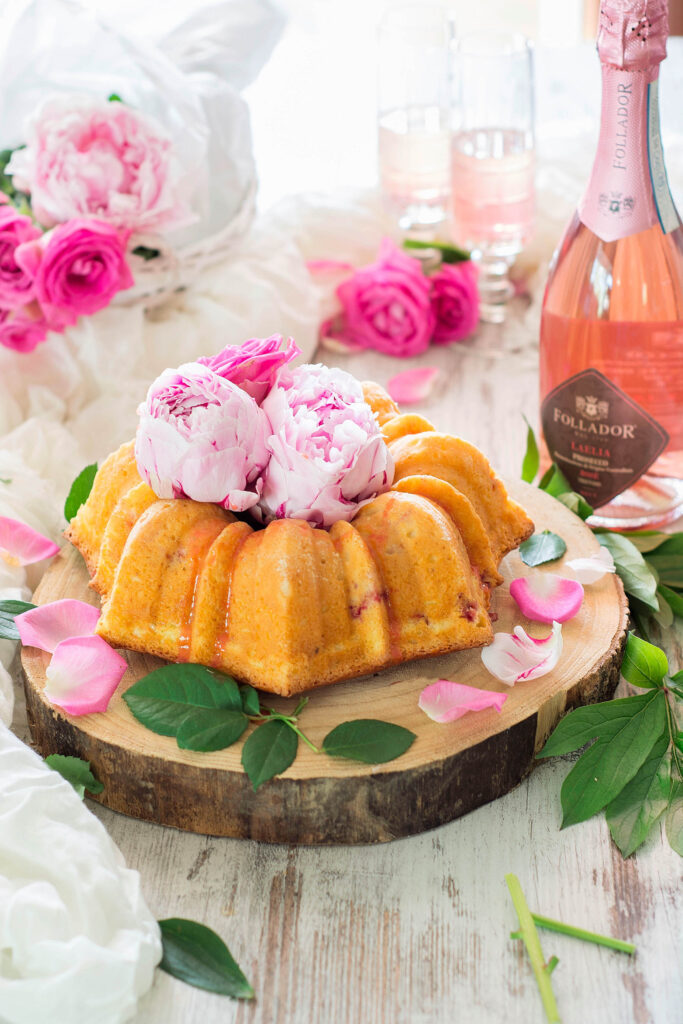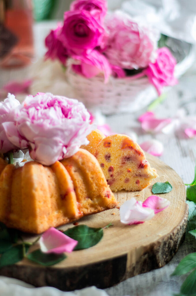 Al centro della composizione, la vera protagonista, è lei la bundt cake. Una ciambella soffice e profumata, con la giusta umidità che rende leggera e irresistibile la fetta, puntellata di pezzettini di fragola. Lo yogurt greco è l’ingrediente segreto che dona alla bundt cake la perfetta consistenza.