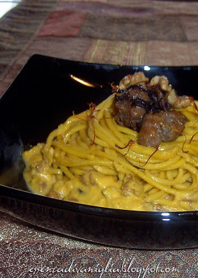 Distribuire la salsa di zafferano e noci nei piatti individuali e adagiarvi le porzioni di chitarra.