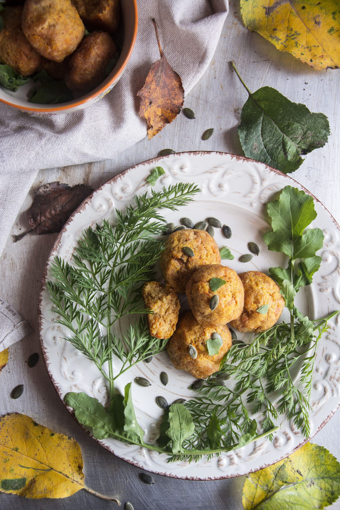 - Sistemate il composto in una ciotola, aggiungete il pane grattugiato, la zucca, le carote, lo zenzero e un po’ di sale. Mescolate bene e fate raffreddare l’impasto in frigorifero per un’ora. Preparate, a questo punto, tante piccole polpettine servendovi di un dosatore da gelato per ottenere una bella forma sferica.