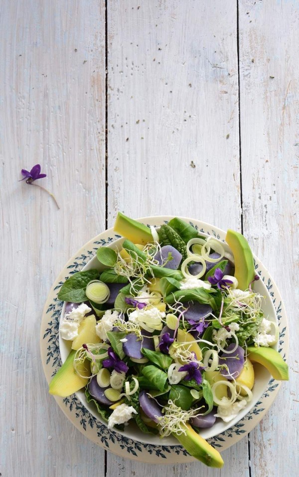 Insalata di Avocado e Patate viola con Songino e Germogli