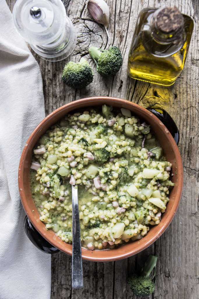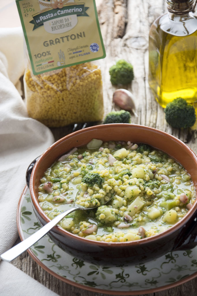 Oggi vorrei parlarvi di una zuppa che mi è piaciuta tantissimo, preparata, appunto, con soli tre ingredienti: dei calamaretti freschissimi trovati dal pescivendolo (provenienti non dall’Atlantico, ma dall’Adriatico!) e tagliati sottili sottili, delle cime di broccoli appena scottate in acqua bollente e qualche patata fatta a cubetti. Più precisamente questi sono gli ingredienti principali, poi ci sono quei piccoli accorgimenti che la rendono buonissima come l’aglio rosso (di Sulmona), un olio extravergine di oliva delle colline abruzzesi, del pepe nero schiacciato e tritato con il coltello, in modo che regali tutto il suo aroma ricco alla zuppa, e la scelta di una pasta eccellente realizzata con grani 100% italiani e come si faceva una volta: i grattini della Pasta di Camerino. Non so se avete mai avuto modo di assaggiare questo tipo di pasta, io la ricordo sin da piccola! Mia nonna la preparava quando faceva la fettuccine, lasciava sempre un po’ di impasto e lo grattugiava per il brodo o per la minestra. E la Pasta di Camerino è riuscita a riproporre nei suoi grattini quel sapore tanto che ad ogni cucchiaiata si rivive il sapore di tempi lontani, quando il gesto autentico e genuino delle nonne impastava questa fantastica pasta all’uovo.